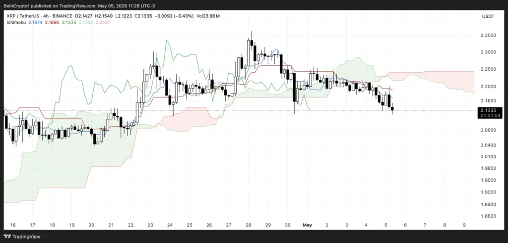 Biểu đồ Ichimoku Cloud cho XRP cho thấy một cấu trúc giảm giá rõ rệt. Giá hiện đang nằm dưới cả Tenkan-sen (đường màu xanh) và Kijun-sen (đường màu đỏ), cho thấy rằng động lực trên các khung thời gian ngắn hạn và trung hạn đều đang hạ.