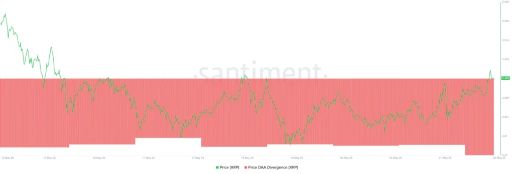 Một trong những nguyên nhân chính gây ra sự sụt giảm này là hoạt động mạng của XRP đang ở mức thấp. Trong khi giá của XRP ghi nhận sự tăng trưởng 4%, chỉ số phân kỳ Giá Địa chỉ Hoạt động Hàng ngày (DAA) của đồng token trước mắt vẫn âm, đạt mức -58.2%. Điều này cho thấy rằng mặc dù giá có xu hướng đi lên, nhưng nhu cầu thực sự không đủ mạnh để hỗ trợ sự tăng trưởng này.