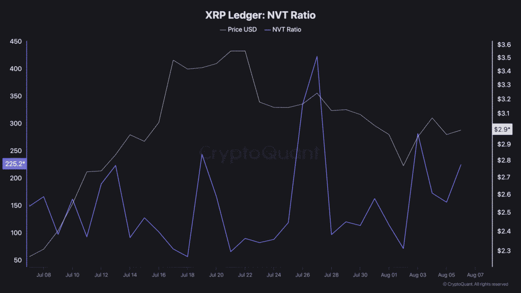 - Tỷ lệ NVT gia tăng: Tỷ lệ NVT của XRP đã tăng 44% trong 24 giờ, cho thấy giá trị thị trường đang vượt xa khối lượng giao dịch on-chain. Tuy nhiên, điều này cũng đặt ra câu hỏi về tính bền vững của đợt tăng giá hiện tại.